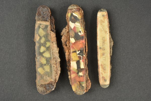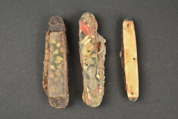 Couteaux de la pointe de Hoc. Trois couteaux de fouilles. Selon les informations du vendeur, ces objets proviennent des alentours de la Pointe du Hoc. Pièces de fouille. Etat III-. 3+