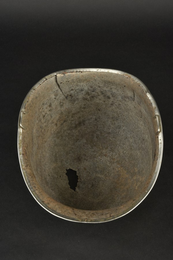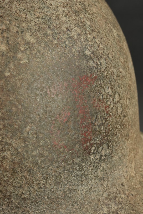 Coque de casque de la 90ème DI US. Coque de casque USM1 en métal. Fermeture du jonc à l'avant. Jonc complet. Pontets fixes. Les jugulaires sont absentes. Numéro de lot illisible. Coque partiellement déformée avec des manques et des fissures, elle est complètement oxydée. Reste d'insigne de la 90ème DI US à 50%, présent sur la face avant de la coque. A noter une certaine usure et oxydation de la pièce. Etat II-. 2-