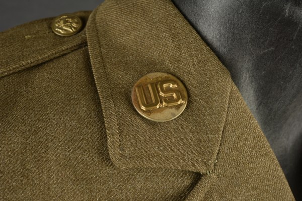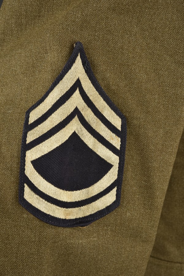Uniforme de sortie de la 90ème DI US. Comprenant une vareuse quatre poches en drap kaki. Tous les boutons sont présents et estampillés de l'aigle américain. Grades de Technical Sergent de second grade cousu main au niveau des manches. Reproduction d'un insigne de la 90ème Di cousu main au niveau de la manche gauche. Disques de col troupe de l'infanterie. Barette de décoration de la Purple Heart et de la Good Conduct Medal. Intérieur doublé en tissu kaki. Nombreux marquages caviardés. Taille 36S. Laundry number P-5268. Indication nominative réalisée au feutre au niveau d'une doublure de poche Burchette. Etiquette du fabricant datée 1940. Quelques réparations visibles. Un pantalon moutarde, en tissu laineux kaki. Tous les boutons sont présents. Bavette anti-gaz en tissu complète. Intérieur doublé en tissu coton blanc. Indication nominative manuscrite RE Thomas. Etiquette du fabricant Kane MFG Co, datée du 2 avril 1942, taille 33x31. A noter une certaine usure et patine de la pièce, ainsi que quelques tâches et accrocs. Etat II+. 2+