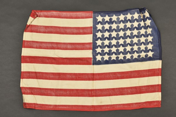 Drapeau US. Petit modèle en tissu coton imprimé. Sans œillets. 48 étoiles imprimées. Mono face. Sans marquages visibles. Dimensions 38 x 53 cm. A noter une certaine usure et patine de la pièce, ainsi que quelques tâches et accrocs. Etat II+. 2+