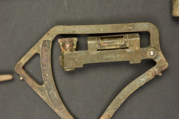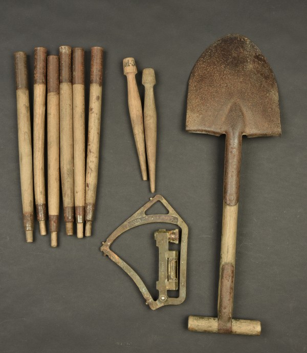 Accessoires US. Comprenant un Gunner Quadrant. En métal, couleur kaki à 60%. Les parties métalliques sont oxydées. Marquages C44899-2. Niveau à bulle cassé. Un rivet a été remplacé par une pièce métallique moderne. Une pelle en T US, manche en bois, la partie métallique est fortement oxydée, mais bien marquée US. Manche en bois dépourvue de peinture. La datation de la pelle est illisible. On y joint cinq mats pour toile de tente, les parties métalliques sont oxydées. Une sardine en bois, sans marquages. A noter une certaine usure et patine des pièces. Etat II+. 2+