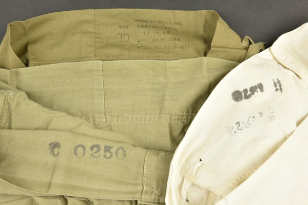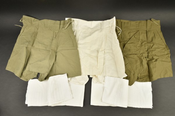 Sous-vêtement US. Comprenant un caleçon court en toile kaki, tous les boutons sont présents. Le cordon de serrage est présent, taille 30, daté du 15 novembre 1942. Un caleçon court en tissu coton blanc, tous les boutons sont présents, le cordon de serrage est présent. Laundry number H-1278. Sans marquages fabricant visibles. Un caleçon en tissu coton kaki, tous les boutons sont présents, le cordon de serrage est présent. Laundry number C-0250. Deux serviettes en tissu coton nid d'abeille blanc. Sans marquages visibles. A noter une certaine usure et patine des pièces. Etat II+. 2+