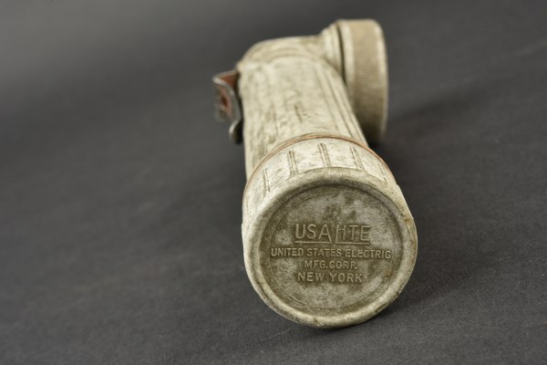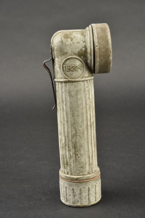 Lampe de poche TL 122-C. En bakélite kaki. Le compartiment à pile est présent, ainsi que l'ampoule. Verre en plastique complet mais devenu opaque avec le temps. Le plastique est également devenu blanc. Le crochet de fixation est complet. Marquages TL-122-C. Toutes les pièces mobile sont fonctionnelles. Fabrication USA Lite. A noter une certaine usure et patine de la pièce, ainsi que des tâches et griffures. Etat II+. 2+