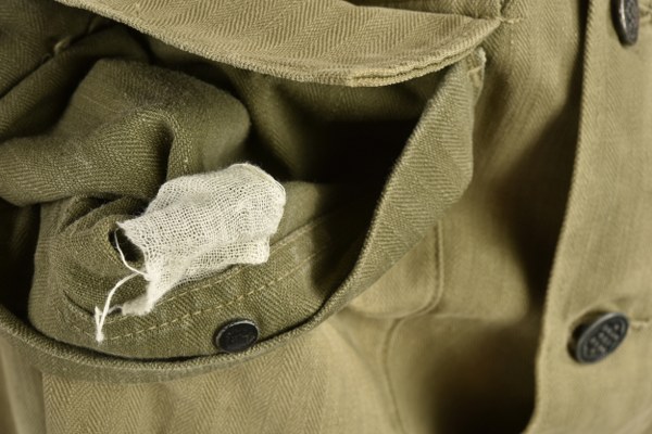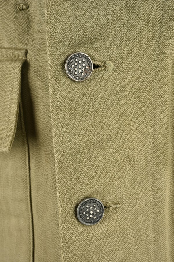 Veste HBT US. En tissu coton HBT OD. Tous les boutons sont présents et estampillés de treize étoiles. Bavette anti-gaz complète. Etiquette dans le col indiquant une taille 38R. Reste de laundry number illisible. Etiquette fabricant présente, mais illisible. A noter une certaine usure et patine de la pièce, ainsi que quelques tâches et accrocs. Etat II+. 2+