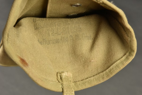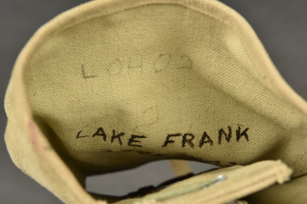 Guêtres US. Comprenant une paire homogène de guêtre en toile OD 3, les lacets sont présents. Les marquages sont partiellement illisibles. Taille 3R. Les crochets de serrage sont partiellement oxydés. Une paire homogène de guêtre en toile OD3, les lacets sont présents, mais postérieurs. Un renfort métallique est manquant au niveau d'une lanière. Les parties métalliques sont partiellement oxydées. Marquages fabricant illisibles. Indication nominative Lake Franck 37450402. A noter une certaine usure et patine des pièces, ainsi que des tâches. Etat II+. 2+