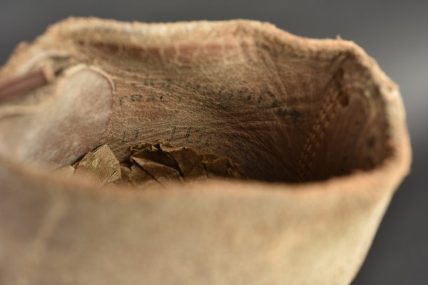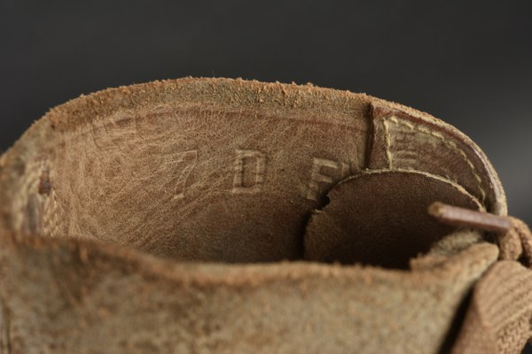 Brodequins US. Paire homogène en cuir retournés. Bouts rapportés. Les lacets sont complets. Marquages sur le côté 7 D FN. Semelles et talons en caoutchouc, marqué HB. Marquages interne partiellement illisibles, mais datés du 30 janvier 1943. Les œillets de laçage sont partiellement oxydés. A noter une certaine usure et patine des pièces. Etat II+. 2+