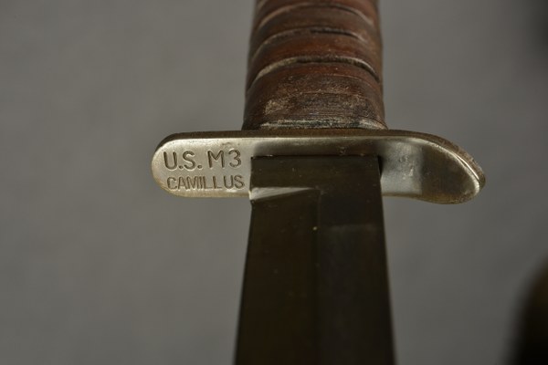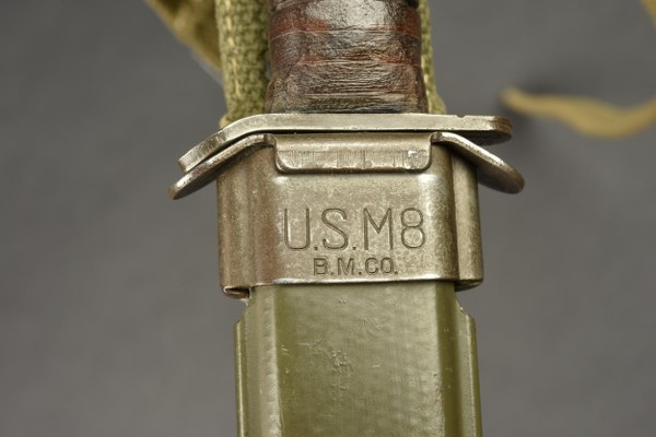 Couteau USM3. Pommeau en métal disposant d'une belle grenade de l'Ordonance Corps US. Un seul rivet visible. Poignée composée d'anneaux en cuir. Belle lame dans sa couleur d'origine à 90%. Fabrication USM3 CAMILLUS, marquages au niveau de la garde. Fourreau USM8 BMCO, dans sa couleur d'origine à 90%. Modèle sans attache pour le ceinturon. Le bouton pression est fonctionnel. Sangle en forte toile web, permettant la fixation à la cuisse. A noter une certaine usure et patine de la pièce. Etat II+. Le couteau est une reproduction, reconnaissable au seul rivet du pommeau, les modèles originaux en possèdent deux. 2+