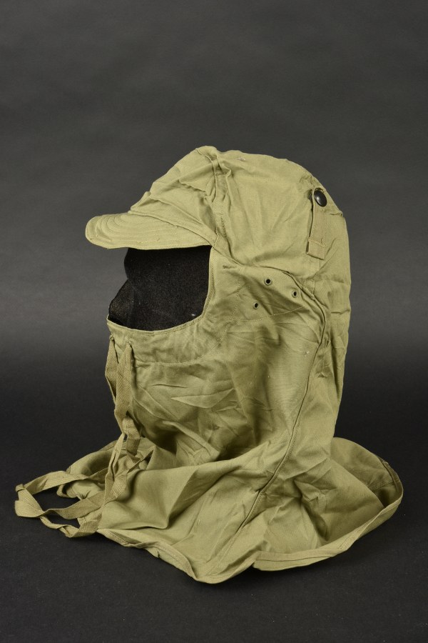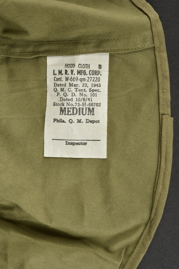 Capuche de veste M-41. En toile OD3. Visière en bon état. Les lacets sont présents. Etiquette du fabricant LMRV MFG Corps, datée du 22 mars 1943. Taille Médium. A noter une certaine usure et patine de la pièce. Etat II+. 2+