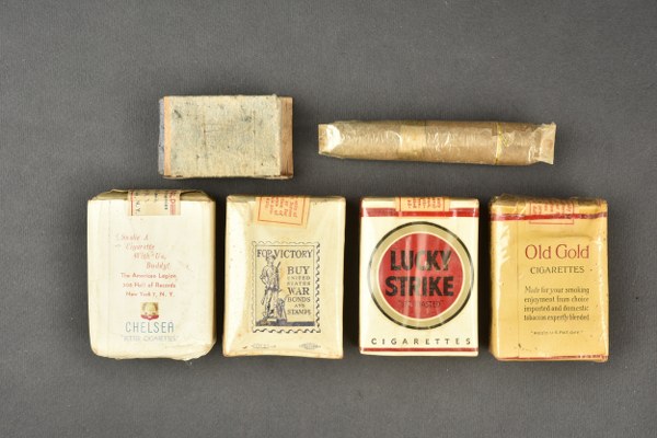 Cigarettes US. Comprenant un paquet de cigarette Chelsea complet jamais ouvert. Un paquet complet de cigarette Old Gold, jamais ouvert. Un paquet complet de cigarettes Lucky Strike, complet jamais ouvert. Un paquet de cigarette Raleigh, jamais ouvert. Un cigare Senator, dans son emballage d'origine. Une boite d'allumettes Independence. A noter une certaine usure et patine des pièces. Etat II+. 2+