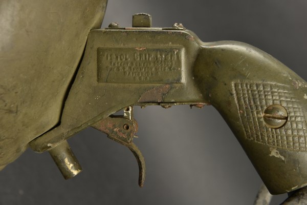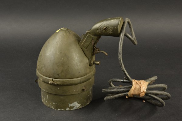 Lampe US pistol light grip. Lampe américaine portative de l'US Army, utilisée comme projecteur de recherchen éclairage de campement, par les mécaniciens pour éclairer le compartiment moteur ou toute autre zone difficile d'accès. Poignée monobloc métallique avec plaquette marquée Patent Number 105703, fabriquée par The S.H. Thomson Mfg. Co. à Dayton (Ohio). Entièrement peinte en vert. Une fissure sur le verre. Fonctionnement non vérifié. II