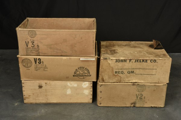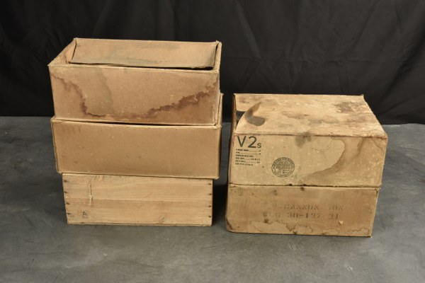 Caisses de ration US. Comprenant une caisse en carton, ouverte et vide, marquée 12 rations KS V3, datée du mois de février 1944. Une caisse de ration en carton, ouverte, les volets ont été recollés, marquages V2, fabrication John F Felke Co, datée septembre 43. Un caisse en carton, ouverte, vide, les volets ont été recollés, fabrication Camon Son, datée du mois de juillet 1944. Une caisse en carton, ouverte, marquée 12 ration KS V3S, datée du mois de février 1944. Une caisse en bois, vide, couvercle manquant, marquages Ration C. A noter une certaine usure et patine des pièces. Etat II+. 2+