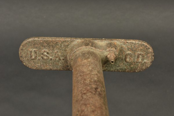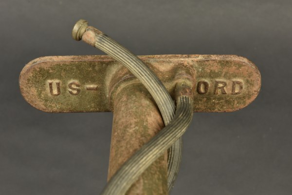 Pompes à vélo US. Comprenant une pompe à vélo en métal, poignée en bois, peinture kaki à 70%, fabrication US ORD, flexible complet, mais visiblement postérieur. Une pompe à vélo en métal, poignée en bois. Peinture kaki à 10%, marquages USA OD, flexible absent. Une pompe à vélo en laiton et métal, fortement oxydée, les marquages sont illisibles. A noter une certaine usure et oxydation des pièces. Etat II+. 2+