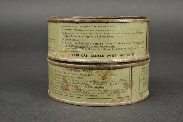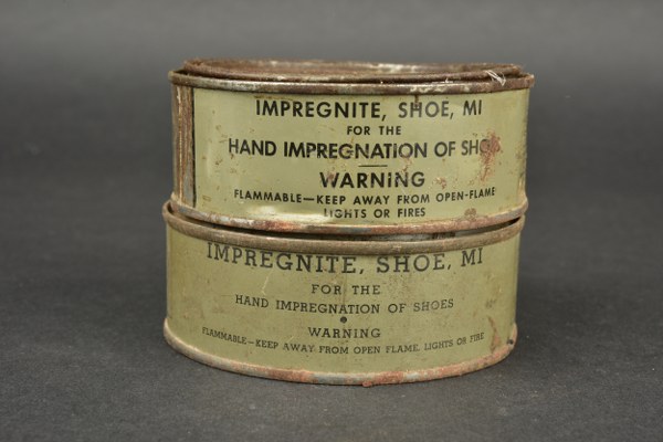 Boites d'imperméabilisant pour chaussure. En métal, complètes. Deux modèles différents. Marquages Impregnite Shoe M1 Hand Impregnation of shoes. A noter une certaine usure et patine des pièces, ainsi qu'une forte oxydation. Etat II+. 2+