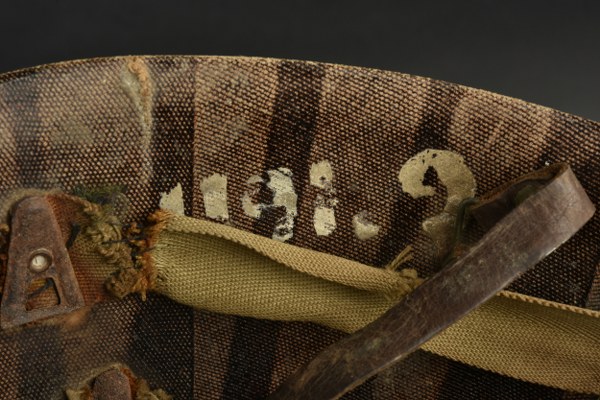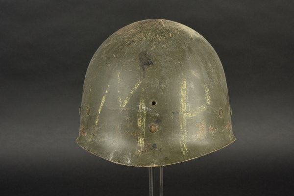 Liner de la military Police US. Liner en matériaux composite haute pression. Fabrication Inland. Coiffe présente mais incomplète. Certaines sangles sont coupées ou déchirées. La nuquière est présente. Le cordon de serrage et le bandeau de sudation sont manquants. Jugulaire en cuir complète sans marquages visibles. Laundry number G-1611, réalisé à la peinture blanche à l'intérieur de la coque. Toutes les pièces métalliques sont fortement oxydées. Peinture extérieure OD7 présente à 70%. Lettrage MP réalisé à la peinture jaune et manuellement sur la face avant de la coque. A noter une certaine usure et patine de la pièce. Etat II+. 2+