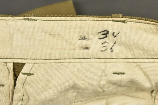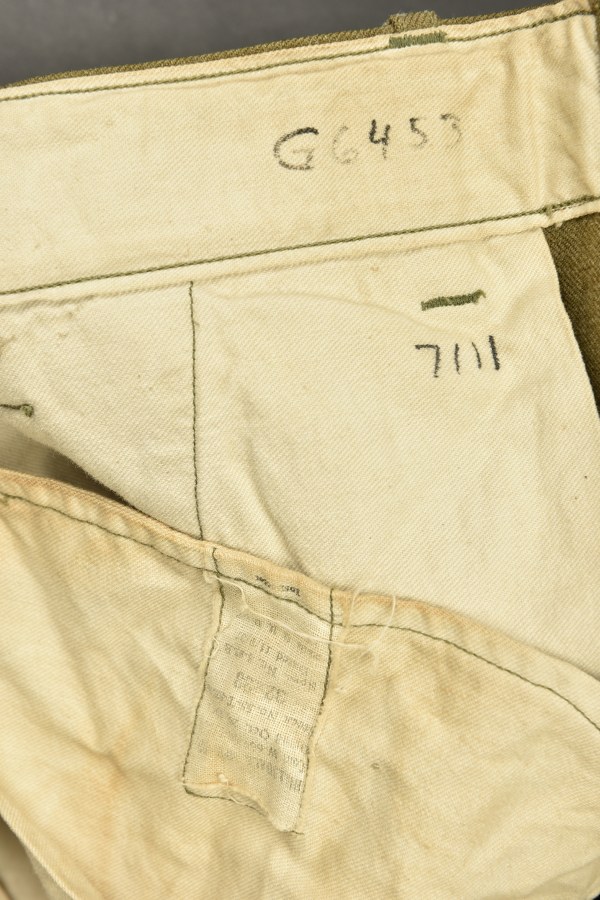 Pantalon moutarde US. En drap couleur moutarde. Tous les boutons sont présents. Modèle sans bavette anti-gaz. Intérieur doublé en tissu coton blanc. Laundry number G-6453. Etiquette fabricant présente, mais illisible. A noter une certaine usure et patine de la pièce, ainsi que des tâches et accrocs. Etat II+. 2+