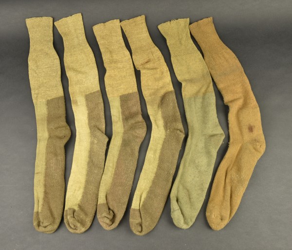 Chaussettes US. Trois paire en laine bicolore. Sans marquages visibles. Une paire n'est pas homogène. A noter une certaine usure et patine des pièces, ainsi que des tâches et accrocs. Etat II+. 2+