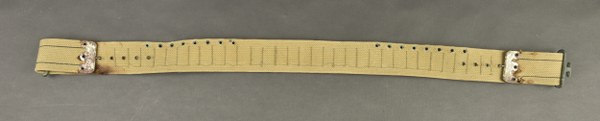 Ceinturon Shotgun US. En épaisse toile OD3. Bouclerie en laiton. Nombreux passant pour la fixation des cartouches du fusil à pompe U. Sans marquages visibles. Les parties métalliques sont oxydées. A noter une certaine usure et patine de la pièce. Etat II+. 2+