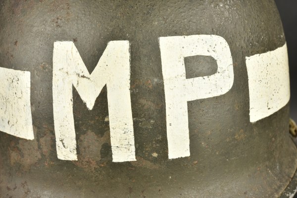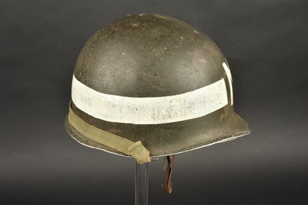 Casque USM1 et liner MP 4th DI. Casque lourd USM1 jonc avect et pattes mobiles. Jugulaires post 1945. Avec bande blanche et lettre MP sur le devant. Liner Firestone peint en blanc, insigne 4th DI de chaque côté et lettres MP en noir sur le devant. Peintures et inscriptions postérieures, sans garantie. Bon état. II