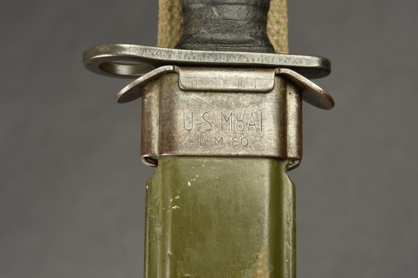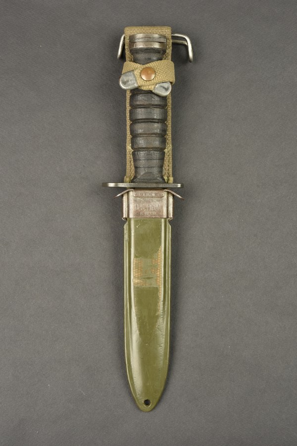 Couteau USM4. Pommeau en métal disposant du marquage H dans un écu, correspondant à la société Imperial Knife co. Les boutons de fixation à l'arme sont fonctionnels. Poignée composée d'anneaux en cuir. Belle lame dans sa couleur d'origine à 90%. Fabrication USM4 CAMILLUS au niveau de la garde. Fourreau USM8A1 BMCO, dans sa couleur d'origine à 70%. Modèle avec attache pour le ceinturon. Le bouton pression est fonctionnel. A noter une certaine usure et patine de la pièce. Etat II+. 2+