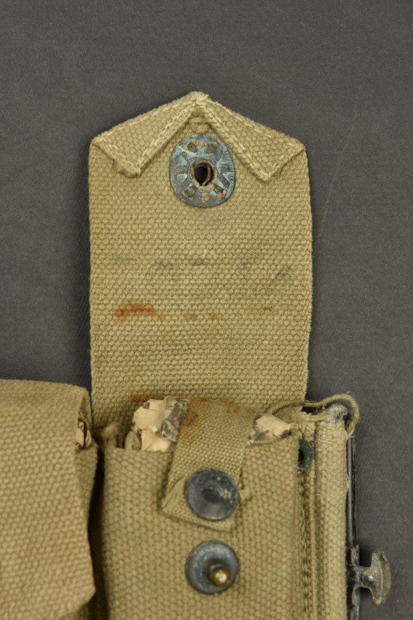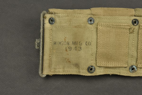 Ceinturon Garand. En forte toile OD. Tous les rabats sont présents. Le boutons pression sont fonctionnels. Bouclerie en laiton. Reste de marquage US sur la première poche. Daté 1943. A noter une certaine usure et patine de la pièce, ainsi que des tâches. Etat II+. 2+