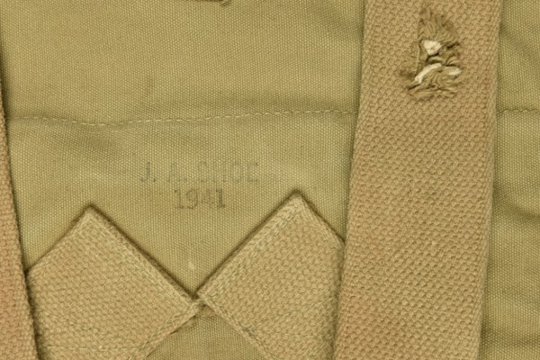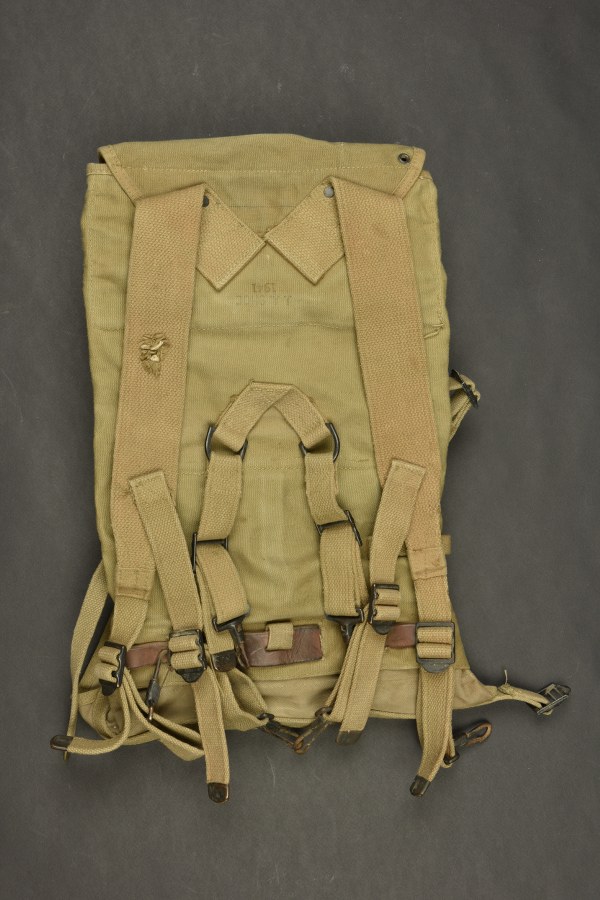 Sac M-28 US. En forte toile OD. Toutes les sangles sont présentes. Les mousquetons sont fonctionnels et complets. Le triangle est présent, avec son beau marquage US et sa patte de fixation en cuir. Fabrication JA Shoe 1941. Reste de laundry number illisible. Pochette pour gamelle complète, laundry number M-0616. Gamelle complète, datée 1944. A noter une certaine usure et patine de la pièce, ainsi que des tâches et accrocs. Etat II+. 2+