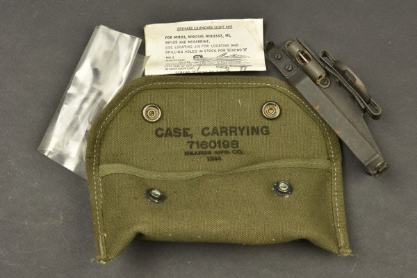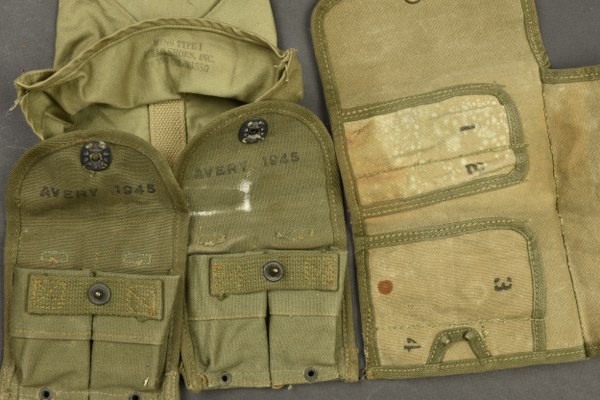 Equipements US. Comprenant une sacoche en forte toile OD, marquée Tool Roll M2, bouton pression fonctionnel. Une housse en forte toile OD, marquée Roll M-13, datée 1944, bouton pression oxydé. Une housse pour chargeurs de carabine USM1, en forte toile OD7, beau marquage US, bouton pression fonctionnel, fabrication Avery 1945. Grenade Sight M15. Complet, housse en forte toile OD7, les boutons pressions sont fonctionnels, fabrication Bearse MFG CO 1944, le crochet de fixation au ceinturon est présent. Une housse pour chargeurs de carabine USM1, bouton pression fonctionnel. Beau marquage US sur le rabat, fabrication Avery 1945. Deux paires de guêtres homogène en forte toile OD, les lacets sont manquants, les marquages sont illisibles. Une paire de gants en toile et cuir fauve, marquage Men's Type 1. A noter une certaine usure et patine des pièces, ainsi que des tâches. Les portes chargeurs de carabine USM1 ne sont pas réutilisés par l'armée française. Etat II+. 2+