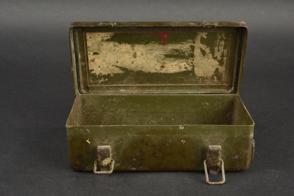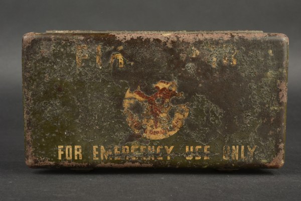 Boite First Aid. En métal. Les crochets de fermeture sont complets et fonctionnels. La poignée de transport est présente. Les marquages sur le couvercle sont quasiment absent. Les racks interne et la notice d'inventaire sont absents. A noter une certaine usure et patine de la pièce, ainsi que oxydation marquée sur les bordures. Etat II+. 2+
