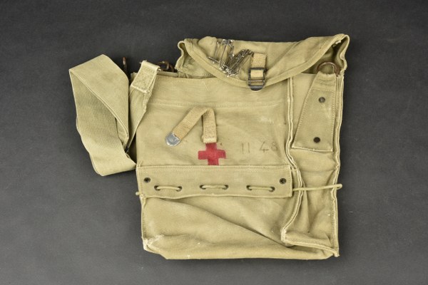 Accessoires médicaux US. Comprenant un bandage ouvert. Une seringue en verre et métal. Une seringue ideal dans sa boite en carton d'origine. Deux pansements Absorbent Cotton. Un pansement Plain Gaze Bandage. Deux bandages jamais ouverts, sans marquages visibles. Un pansement Plain Gauze Bandage. Un pansement First Aid Small. Quelques instruments chirurgicaux et un stéthoscope, tous de fabrication française. Un pansement Large First Aid. Un pansement small First Aid. Deux garrots US. Un pansement individuel dans sa boite en carton d'origine. Une seringue en métal et verre. Une boite de stérilisation des aiguilles. Un pansement Large First Aid. Une pochette médicale US, en forte toile OD, réutilisation française. A noter une certaine usure et patine des pièces. Etat II+. 2+