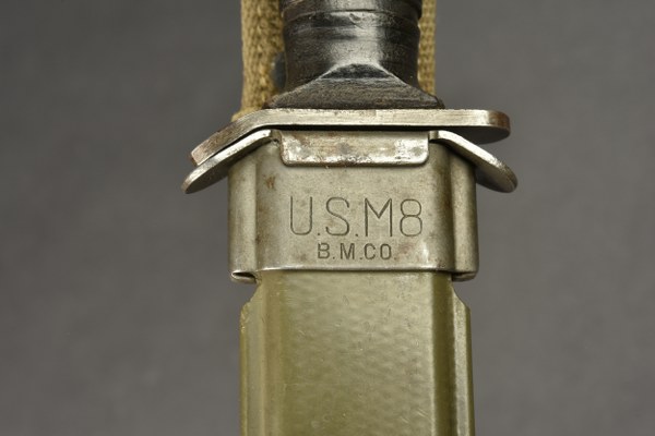 Couteau USM3. Pommeau en métal disposant d'une belle grenade de l'Ordonance Corps US. Poignée composée d'anneaux en cuir. Belle lame dans sa couleur d'origine à 90%. Fabrication USM3 CAMILLUS. Fourreau USM8 BMCO, dans sa couleur d'origine à 90%. Modèle sans attache pour le ceinturon. Le bouton pression est fonctionnel. Lacet en toile complet mais dénoué. A noter une certaine usure et patine de la pièce. Etat II+. 2+