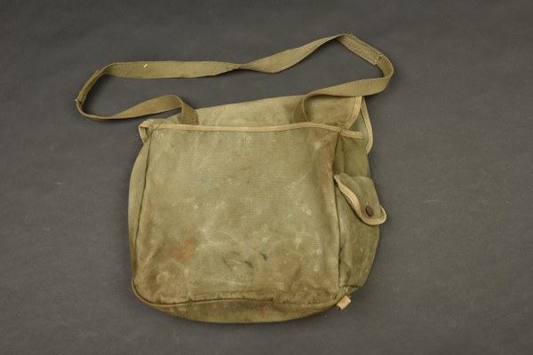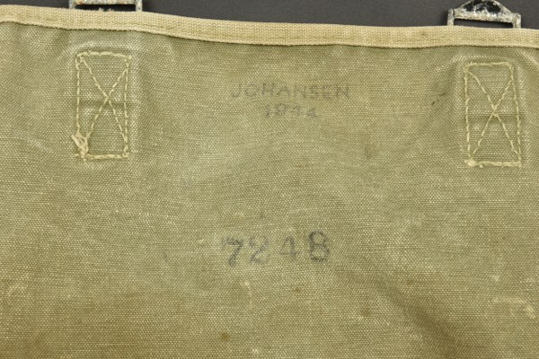 Musette US M-36. En forte toile OD. Toutes les sangles sont présentes. La sangle de transport a été modifiée par la couture d'une sangle directement au dos du sac. Beau marquage US sur le rabat. Les sangles de fermeture sont incomplètes. Fabrication J Chansen 1944. Laundry number 7248. Les parties métalliques sont oxydées. A noter une certaine usure et patine de la pièce, ainsi que quelques tâches. Etat II+. 2+