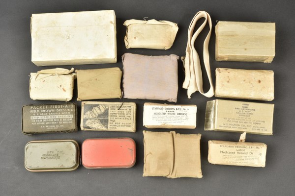 Ensemble de pansements US. Comprenant un pansement dans sa boite en métal kaki, fabrication Bauer & Black Div of the Kendall co Chicago. Un pansement britannique complet, jamais ouvert, fabrication Arthur Berton Ltd London, daté février 1942. Un pansement britannique Stardard Dressing N15, daté 1943, jamais ouvert. Un pansement britannique jamais ouvert, fabrication Arthur Berton Ltd London, 1941. Un pansement jamais ouvert, Standard Dressing BCP NO9, daté avril 1944. Un pansement dans sa boite d'origine, marqué Bandage Gauze Compress, AE Halperin Co Inc Boston Mass. Un pansement jamais ouvert, Standard Dressing BPC N0 9, daté avril 1944. Un pansement dans son emballage d'origine jamais ouvert, Large First Aid Dressing, Acme Cotton Products Co Inc, daté janvier 1942. Un pansement jamais ouvert, marqué Absorbent cotton. Un pansement jamais ouvert, marqué Packet First AId Field Brown Dressing, AE Halpering Co Inc. Un pansement jamais ouvert, marqué Small First AId Dressing, AE Halperin CO Inc, daté du 18 septembre 1942. Un pansement marqué Large First Aid Dressing jamais ouvert, The American White Cross Laboratories Inc, daté 1940. Un pansement individuel français, jamais ouvert, daté 1939. Un pansement First Field Dressing britannique, daté 1942. Un pansement dans sa boite en métal couleur orange, jamais ouvert, fabrication Bauer & Black Div Of The Kendall Co Chicago. Un garrot complet. A noter une certaine usure et patine des pièces. Etat II+. 2+