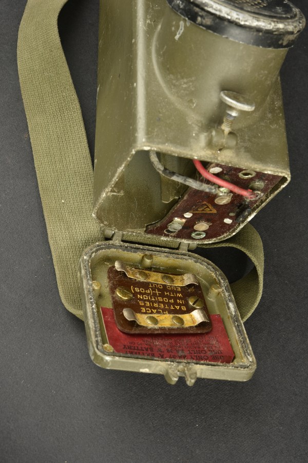 Radio receiver BC-611-F. En métal. Couleur kaki lisse à 80%. Antenne télescopique complète. Toutes les pièces mobiles sont fonctionnelles. Piles manquantes. Plaquette marquée Signal Corps US Army Radio Receiver and Transmitter BC-611-F. Datée 1945. Sangle de transport présente. Fabrication Galvin MFG Corporation Chicago Illinois. A noter une certaine usure et patine de la pièce. Etat II+. 2+
