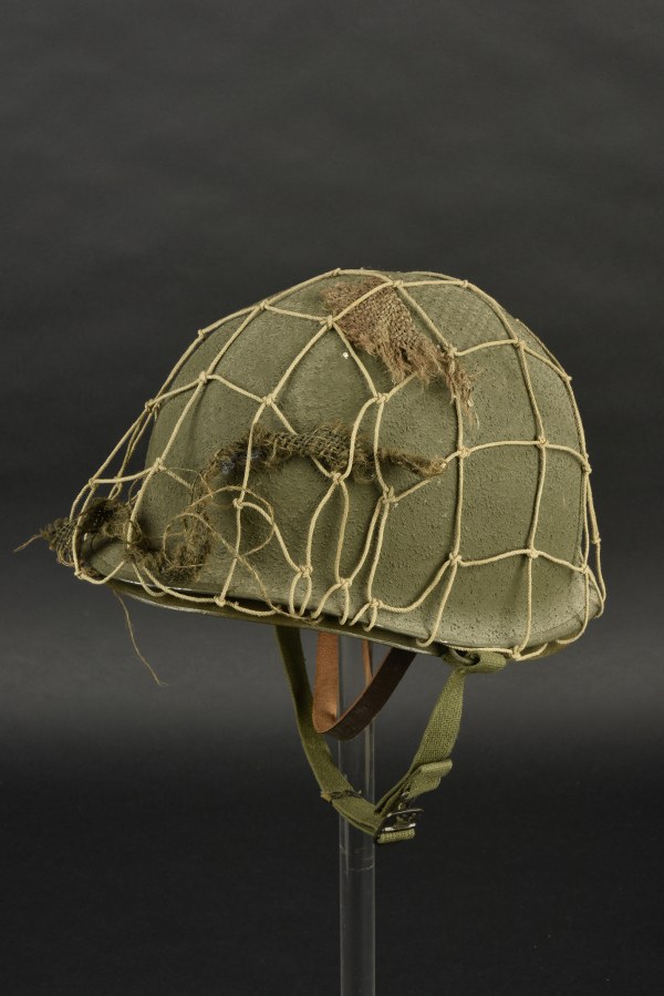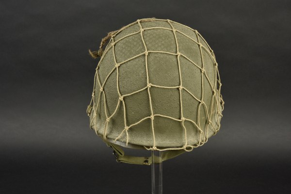 Casque USM1. Coque de casque USM1. Fermeture du jonc à l'avant, numéro de lot illisible. Pontets mobiles. Les jugulaires sont présentes et cousues d'origine. Peinture et cork à 90%. Filet de camouflage daté 1944, avec rajouts de toiles de jute. Liner en matériaux composite haute pression, fabrication Westinghouse. Coiffe complète, nuquière manquante. Jugulaire en cuir marquée United. Peinture extérieure postérieure. A noter une certaine usure et patine de la pièce. Etat II+. 2+