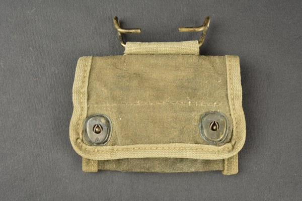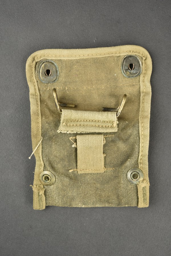 Housse pour boussole US. En forte toile imperméabilisée kaki. Les boutons pressions sont fonctionnels. Le crochet de fixation au ceinturon est présent. Sans marquages visibles. A noter une certaine usure et patine de la pièce. Etat II+. 2+
