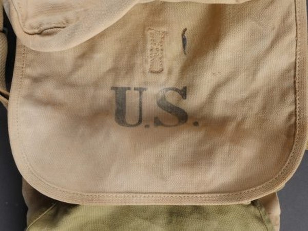 Sac à dos US M-1910. En forte toile OD, beau marquage US sur le rabat. Le triangle est un modèle de la seconde guerre mondiale, avec sa sangle en cuir. Toutes les sangles sont présentes. Fabrication RIA 1918. Pochette pour gamelle complète avec son bouton de fermeture. A noter une certaine usure et patine de la pièce, ainsi que des tâches. Etat II+. 2+