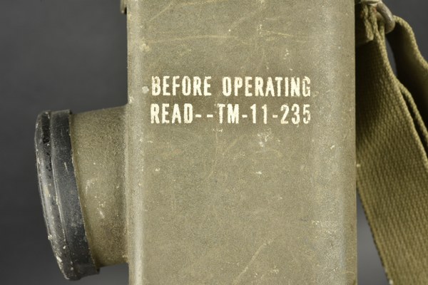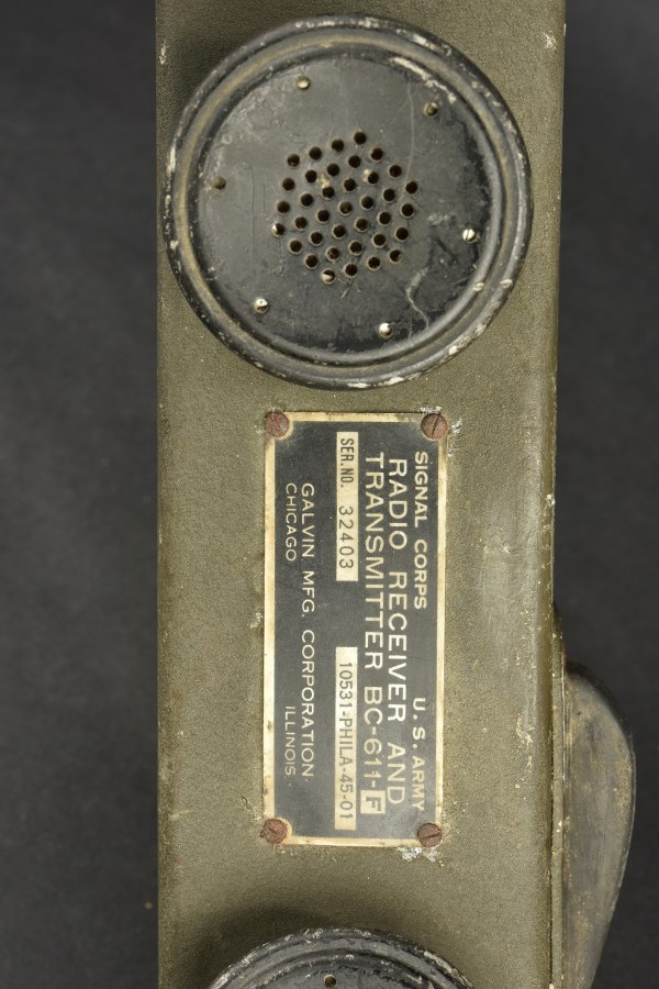 Radio receiver BC-611-F. En métal. Couleur kaki texturée à 80%. Antenne télescopique complète, sauf le socle qui présente un manque. Toutes les pièces mobiles sont fonctionnelles. Piles manquantes. Section pour le branchement d'un casque audio ou microphone, fixé à la base de l'appareil. Sangle de transport présente. Marquages latéral Before Operating Read TM 11-235. Plaquette marquée Signal Corps US Army Radio Receiver and Transmitter BC-611-F. Datée 1945. Fabrication Galvin MFG Corporation Chicago Illinois. A noter une certaine usure et patine de la pièce. Etat II+. 2+