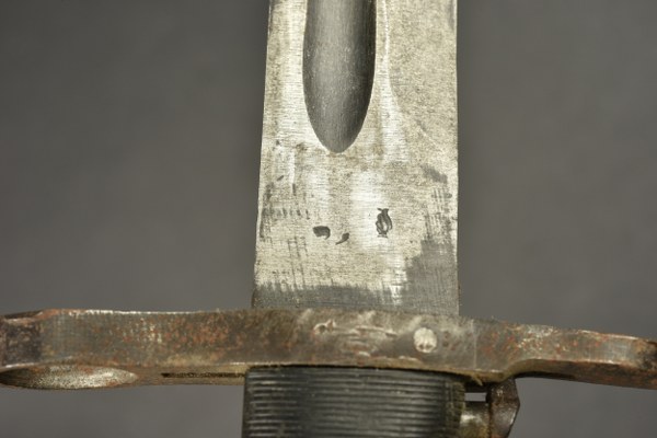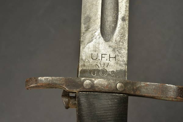 Baïonnette de Garand. Modèle courte. Plaquettes en bakélite. Les garnitures métalliques sont partiellement oxydées. Lame en relativement bel état. Fabrication UFH US. Fourreau complet. Le crochet de fixation au ceinturon est présent. Peinture kaki à 80%. Toutes les garnitures métalliques sont oxydées. Lacet en cuir tressé fixé au fourreau. A noter une certaine usure et patine de la pièce. Etat II+. 2+