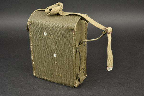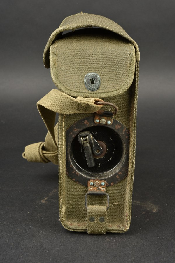 Téléphone de campagne US. Housse en toile imperméabilisé OD. Le bouton pression est fonctionnel. La sangle de transport est présente. Marquages Signal Corps US Army. Certains marquages sont illisibles. Combiné présent avec son câble. Manivelle latérale mobile. A noter une certaine usure et patine de la pièce, ainsi que des tâches et marques d'oxydation. Etat II+. 2+