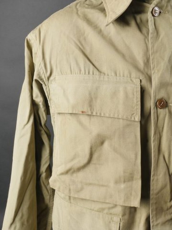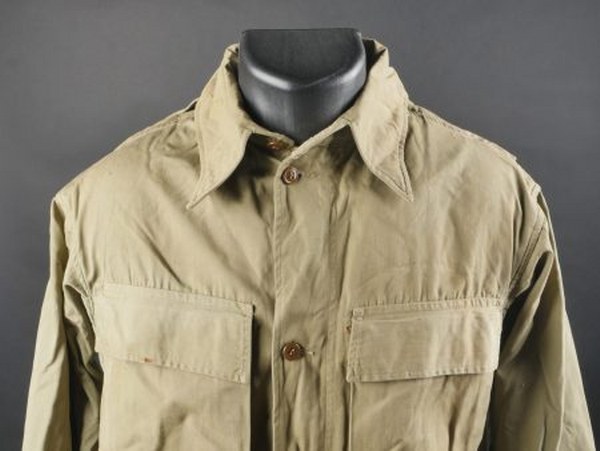 Vareuse des troupes de montagne US. En tissu coton OD. Bas des manches partiellement effilochées. Fermeture éclaire fonctionnelle, fabrication Talon. Les bretelles interne sont présentes. Grande poche au dos de la pièce. Etiquette fabricant absente. Capuche présente avec son cordon de serrage. A noter une certaine usure et patine de la pièce, ainsi que quelques tâches. Etat II+. 2+