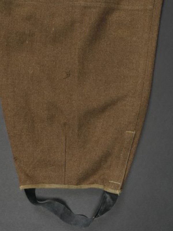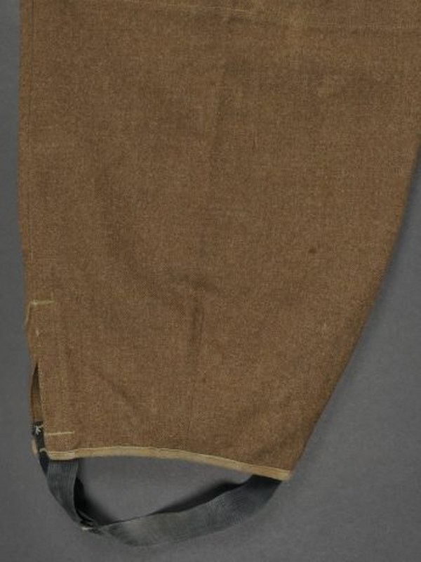 Pantalon de ski US. En épais drap kaki. Modèle de pantalon spécifique aux skieurs de l'armée US. En forme de fuseau, les élastiques au bas des jambes sont souples. Les poches de hanche ferment par des fermetures éclaires. Braguette complète, et fonctionnelle, fabrication Conmar. Tous les boutons sont présents. Intérieur doublé en tissu coton blanc, certaines coutures au dos ont été reprises. Taille W34 L 31. Etiquette fabricant présente mais illisibles. A noter une certaine usure et patine de la pièce, ainsi que quelques tâches et accrocs. Etat II+. 2+