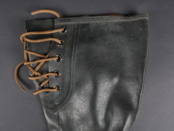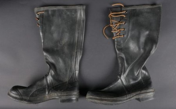 Bottes en caoutchouc US. Paire homogène en caoutchouc noir, les lacets en cuir sont présents. Semelles marquées 7W, talons fabrication Hood. Marquages intérieurs illisibles. A noter une certaine usure et patine des pièces. Etat II+. 2+
