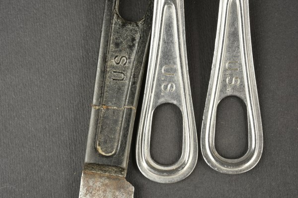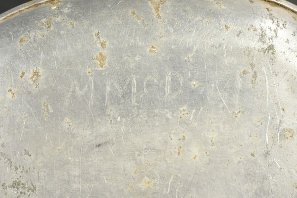 Pochette pour gamelle et accessoires. Housse en forte toile OD, la sangle de fermeture est complète. Gamelle complète, les parties métalliques sont fortement oxydées. Une cuillère et une fourchette en métal. Un couteau avec manche en bakélite, la lame est fortement oxydée, le manche est cassé et réparé avec de la colle. Une housse en cuir pour la protection du couteau. A noter une certaine usure et patine des pièces, ainsi que des tâches et marques d'oxydation. Etat II+. 2+