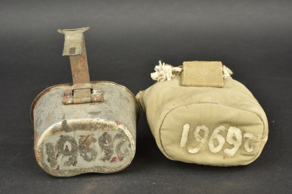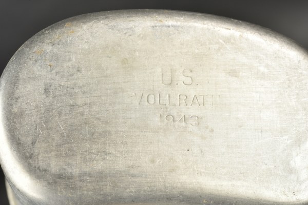 Gourde US nominative. Housse en forte toile OD. Les boutons pressions sont fonctionnels. Le crochet de ceinturon est absent. Fabrication illisible. Laundry number 2696I. Quart fortement oxydé, sans marquages visibles. Gourde complète avec son bouchon et sa chaînette. Fabrication Vollrath 1943. A noter une certaine usure et patine de la pièce, ainsi que des tâches. Etat II+. 2+