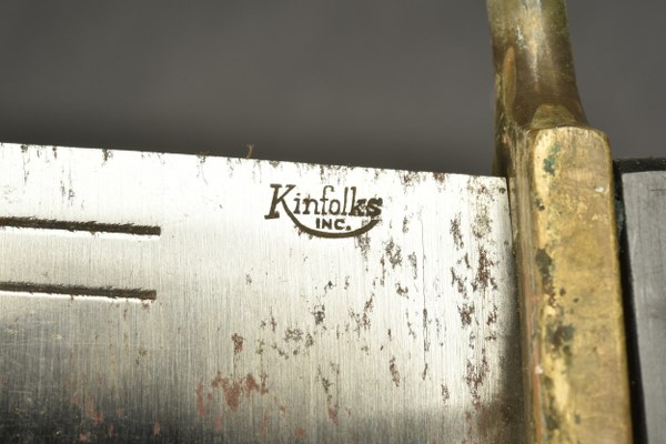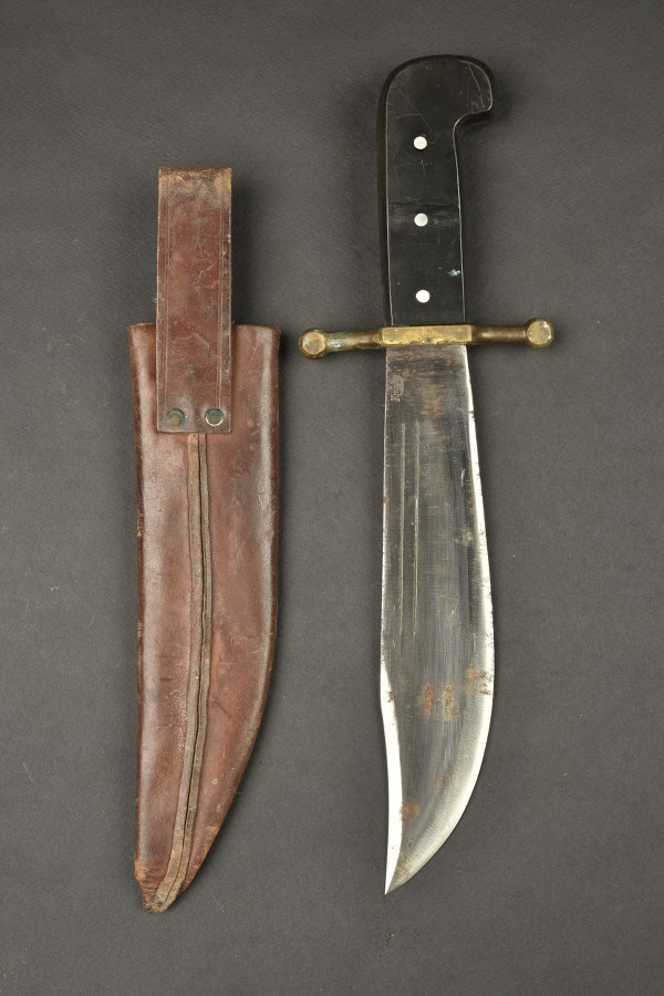Poignard de survie et de combat V44 Kinfolks. D'une longueur totale 36,5 cm avec une lame Bowie a deux gouttières . Le ricasso porte l'inscription Kinfolks / INC. près du dos, avec un « K » avant en arc de cercle soulignant le mot. Quelques traces d'oxydation. Poignée à plaquettes Bakélite noire à trois rivets , garde en laiton. Dans son fourreau d'origine en cuir avec patte de ceinturon rivetée. II