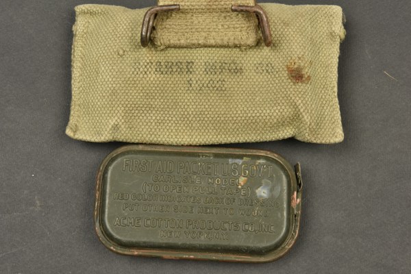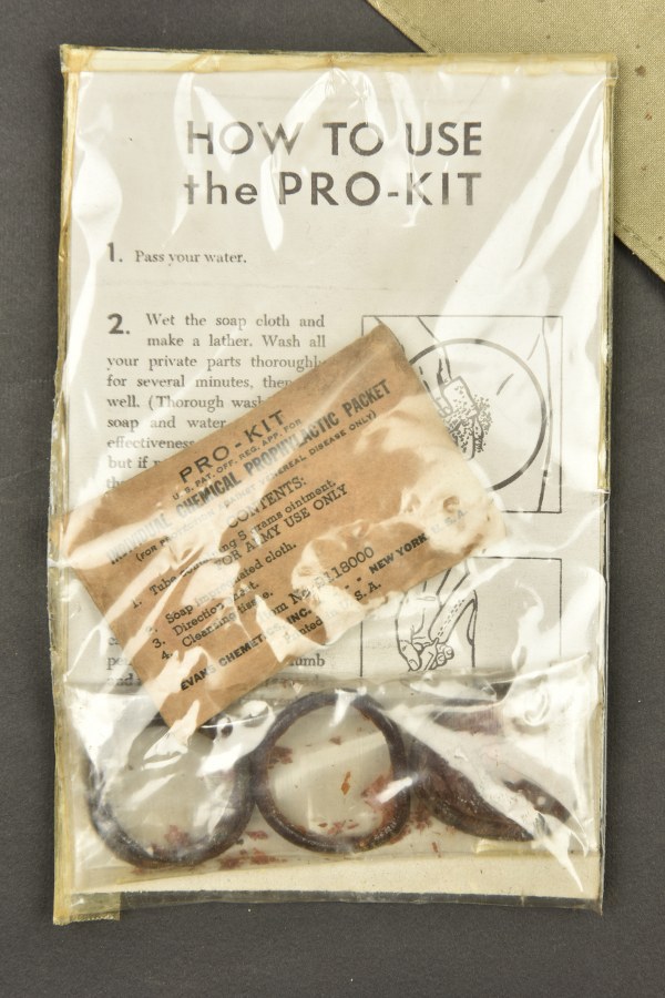 Accessoires US. Comprenant trois préservatifs de fouille. Un sachet complet, marqué Pro Kit Individual Chemical Prophylatic Packet. Un jeu de carte Caravan, nombreuses réparations au scotch. Une planche en mica et toile kaki, pour les portes carte US. Un préservatif dans son emballage d'origine. Une pochette pour pansement en forte toile OD, le crochet de fixation au ceinturon est présent. Fabrication illisible, bouton pression fonctionnel, reste de marquage US sur le rabat. Un pansement dans sa boite en métal kaki. A noter une certaine usure et patine des pièces. Etat II+. 2+