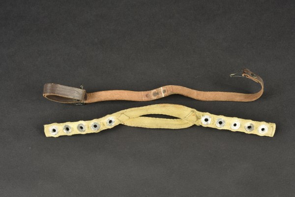 Mentonnière de parachutiste US. En toile kaki. Cinq œillets de réglage. Les parties métalliques sont oxydées. On y joint une jugulaire de liner US, complète, fabrication DOT. A noter une certaine usure et patine des pièces. Etat II+. 2+