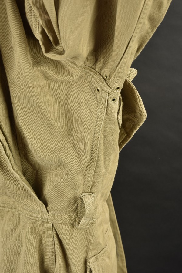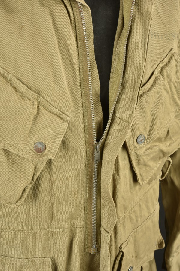 Veste M-42 du parachutiste Vienchowski. En tissu OD 3. Tous les boutons pressions sont fonctionnels. La ceinture est manquante. Fermeture éclaire de la poche du couteau est fonctionnelle et de fabrication Conmar. Fermeture éclaire principale fonctionnelle, mais présentant des marques d'oxydation. Fabrication Talon. Quatre œillets d'aération au niveau des aisselles. Indication nominative réalisée au pochoir Vienchowski au niveau de la poitrine gauche. Laundry number V-8872 au niveau du col. Etiquette fabricant absente. Reproduction d'un patch de la 82ème airborne cousu main au niveau de la manche gauche. Selon les recherche menées, Vincent Vienckowski, numéro matricule 32778872, appartenait à la compagnie C du 517ème PIR. Selon le Morning Report daté du 15 août 1944, il était stationné à Cannio en Italie, avant de sauter sur la Provence. Le nom réalisé au pochoir, comporte une erreur, mais le laundry number dans le col, indique bien qu'il s'agit de Vincent Vienckowski. Il est décédé le 20 février 2010. A noter une certaine usure et patine de la pièce, ainsi que des tâches et accrocs. Les documents de recherche sont joint. Etat II+. 2+