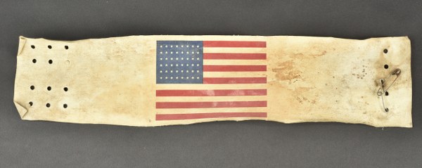 Brassard d'invasion. En toile imperméabilisée blanche. Drapeau US imprimé 48 étoiles. Plusieurs rangées de perforation de réglage au dos. Deux épingles à nourrice complètes, mais fortement oxydées. Toile relativement rigide. A noter une certaine usure et patine de la pièce, ainsi que des tâches. Etat II+. 2+