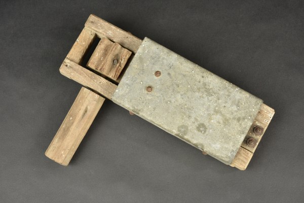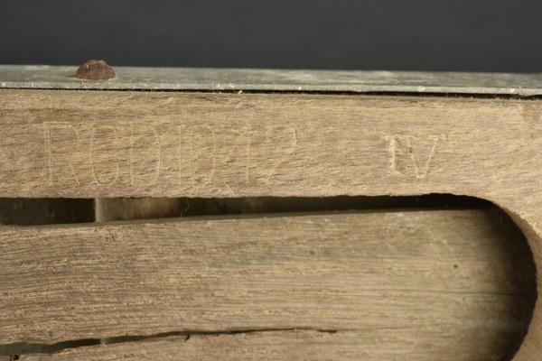 Crécelle anti-gaz. Fabrication en bois et métal. Fonctionnelle. La lamelle en bois est fragilisée avec des fissures et manques visibles. Fabrication RCD 1942 IV. La partie métallique est partiellement oxydé. A noter une certaine usure et patine de la pièce. Etat II+. 2+
