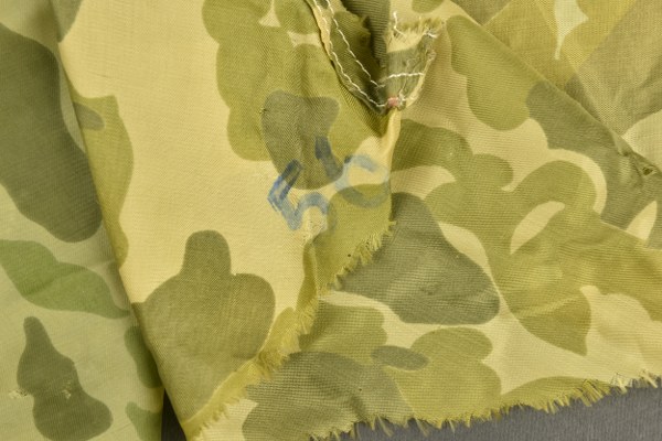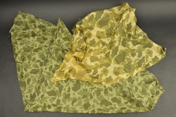 Morceaux de voilure de parachute. Deux morceaux de voilure de parachute camouflé. A noter une certaine usure et patine des pièces, ainsi que des tâches. Etat II+. 2+